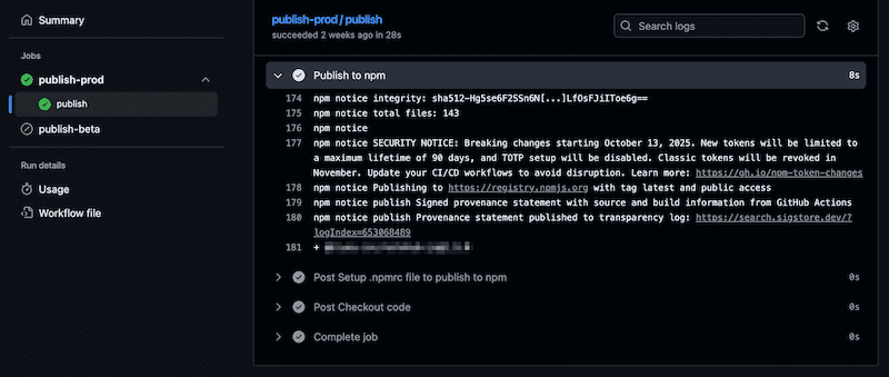 To verify it correctly deployed, I checked the GH Actions workflow logs, and at the bottom of the "Publish Beta Version to npm" step, I can see the text, "npm notice publish Signed provenance statement with source and build information from GitHub Actions".